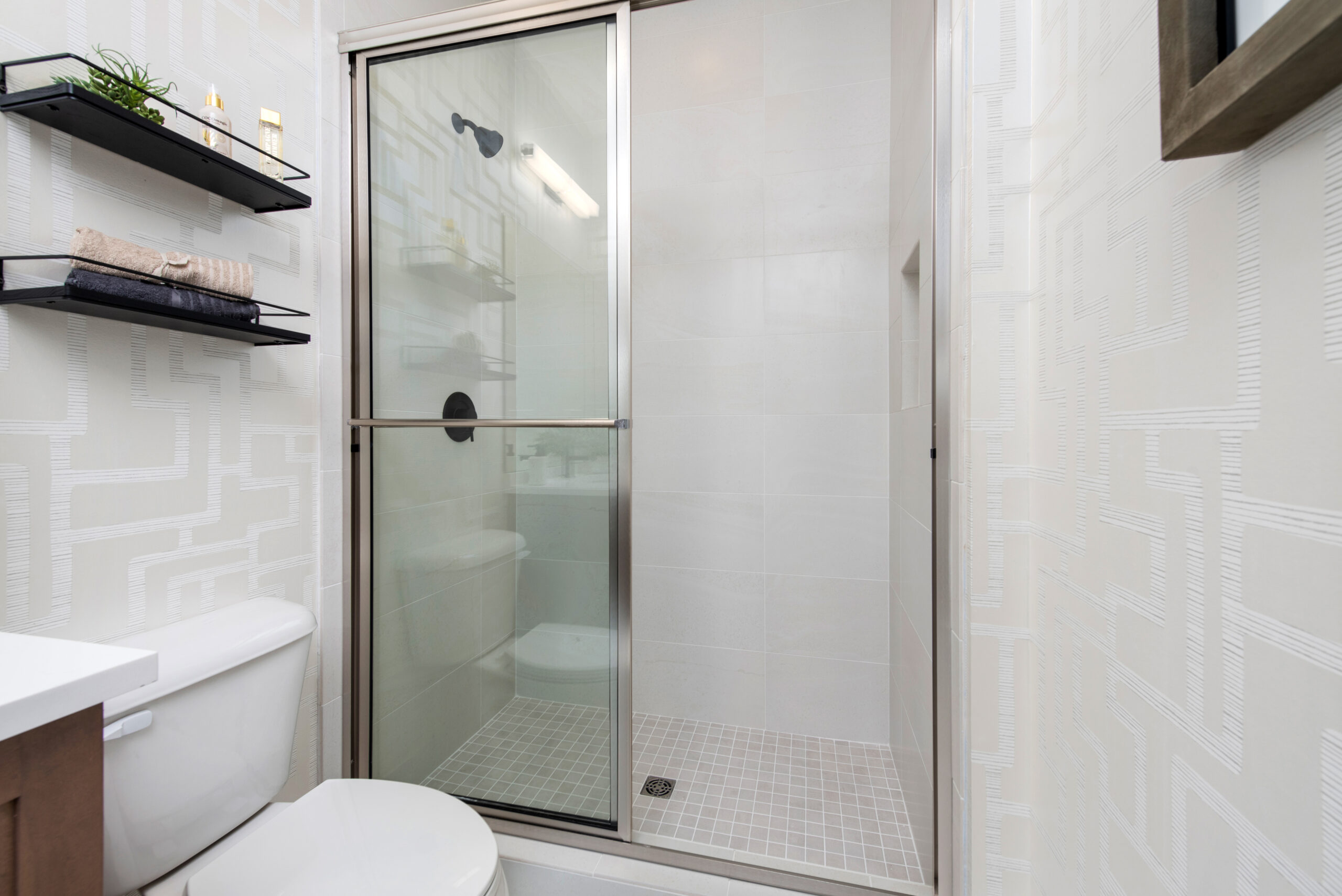 Tranquility Coast Matte*: 12×24 Matte Wall Tile, 2×2 Sinova Shower Floor (if applicable)
